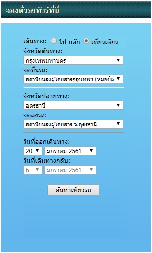 จากเมนูการจองด้านบนคือ การเดินทางเที่ยวเดียว จากกรุงเทพมหานคร ขึ้นรถที่หมอชิต 2 ไปยังปลายทาง จังหวัดขอนแก่น ลงที่บขส. อุดรธานี เดินทางวันที่ 20 มกราคม 2561